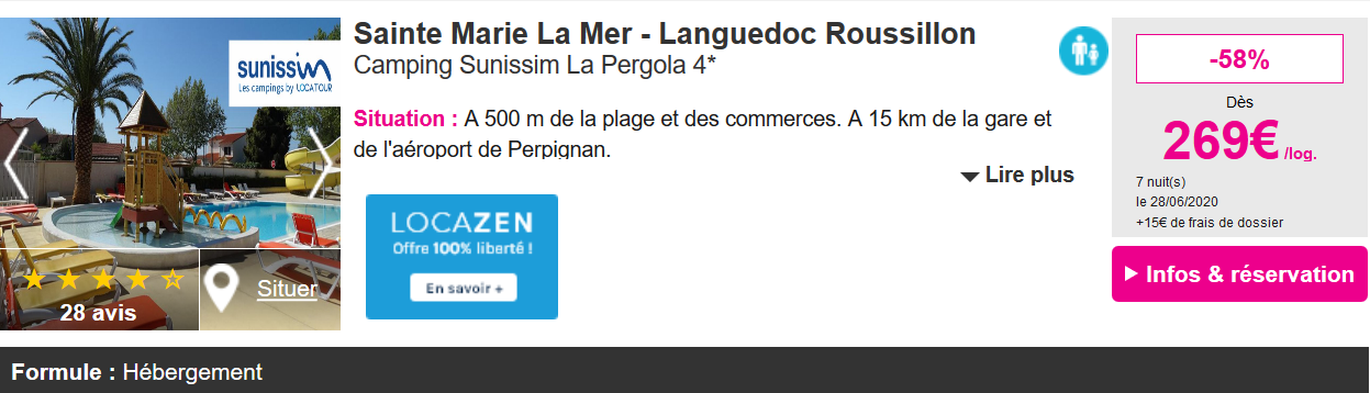 Nous y sommes ! L' heure des vacances est arrivée ! Bienvenue au camping La Pergola 4* situé à 500 mètres de la plage de Sainte Marie La Mer ! Un mot d' ordre pour un séjour réussi : profiter ! Le complexe dispose d'un bassin de 150m2 avec tobbogan aquatique de quoi ravire petits et grands. Mais ce n'est pas tout ! Vous y découvrirez terrains de pétanque, structures gonflables, aires de jeux et également un snack/bar et une épicerie et beaucoup d'autres activités de loisirs . Les enfants seront les rois du séjour puisque le camping dispose également d'un club enfants proposant de multiples activités tout au long de votre séjour . Vous serez logés en mobilhomme 4/6 personnes avec loggia avec un coin cuisine équipé, deux chambres, un séjour, WC et salle de bain et bénéficierez donc d'une terrasse semi-couverte .