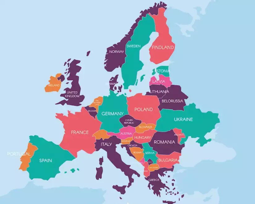 L'Europe est un continent de 46 pays répartis en cinq régions géographiques. Superficie de l'Europe : 10 180 000 km2. La population de l'Europe : 743 000 000. Densité (habitants au km²) : 73 hab/km². Le point culminant : Elbrouz (chaîne de montagnes en Russie) avec 5.643 m.