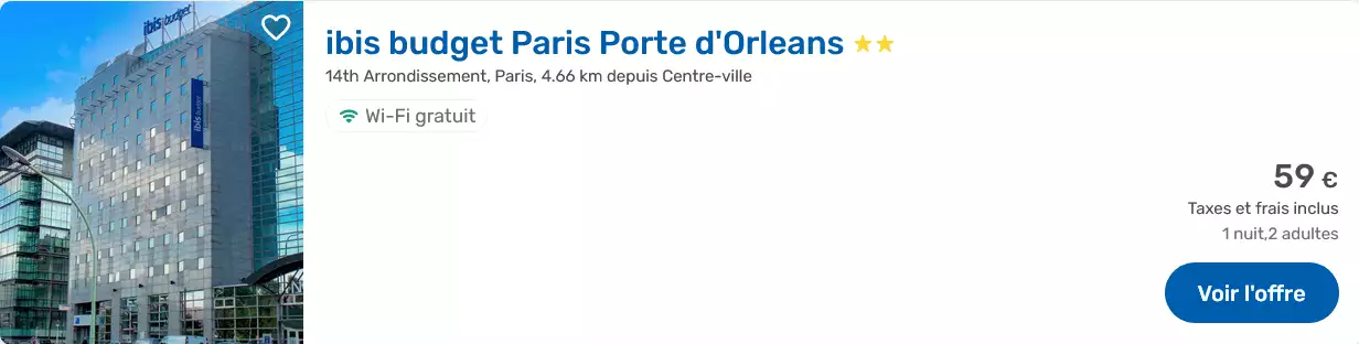 L'ibis Paris Porte d'Orléans est situé un peu au sud du quartier parisien de Montparnasse, à 10 minutes à pied de la station de métro Porte d'Orléans. Il dispose d'un bar avec terrasse, d'un restaurant et d'une connexion Wi-Fi gratuite. C'est un hôtel bon marché et bien situé.