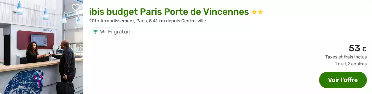 L'Ibis budget Paris Porte de Vincennes est un hôtel abordable récemment rénové qui offre un excellent rapport qualité-prix. L'hôtel est situé juste derrière le périphérique, à 5 minutes du métro et à un quart d'heure du Château de Vincennes. Il propose ses 208 chambres climatisées, ainsi qu'un parking privé et un espace terrasse où passer un moment de détente au soleil.