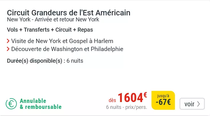 Un circuit découverte aux Etats-Unis ? Direction l'Est Américain et ses grandes et célèbres villes ! Pour commencer vous découvrirez New York, la ville qui ne dort jamais ! On ne la présente plus ! à vous la découverte de Times Square, de ses hauts grattes-ciels, chinatown, Manhattan etc... Ensuite stop sur Philadelphie pour y découvrir son histoire notamment avec le Hall de l'indépendance et pleins d'autres lieux touristiques puis direction lancaster pour vous imprégner de l'ambiance amish. Votre circuit passera également à Washington où ous découvrirez la maison blanche notamment. Un séjour totalement immersif dans l'Est Américain ! Un circuit à petit prix aux Etats-Unis en passant par New York et Washington c'est une expérience incroyable à vivre ! Alors laissez-vous tenter et envolez-vous pour ce pays fantastique et grandiose !