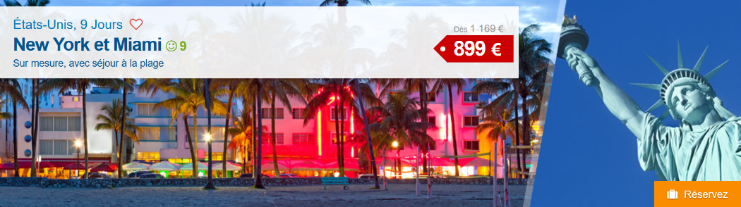 Découvrir New York ça vous tente ? Surnommée la Grosse Pomme, cette ville ne dort jamais ! Durant votre séjour, ne manquez pas de visiter la célèbre statue de la liberté, Central Park sans oublier Times Square. Puis direction les plages ensoleillées de Miami ! Avec son climat idéal , ses plages immenses et des températures estivales toute l'année Miami ne manque pas de charme. Vous pourrez profiter des quartiers Coral Gables et Coconut Grove ...bref vous ne vous ennuirez pas ! Logitravel vous propose ce voyage à partir de 899€ par personne à saisir d'urgence !