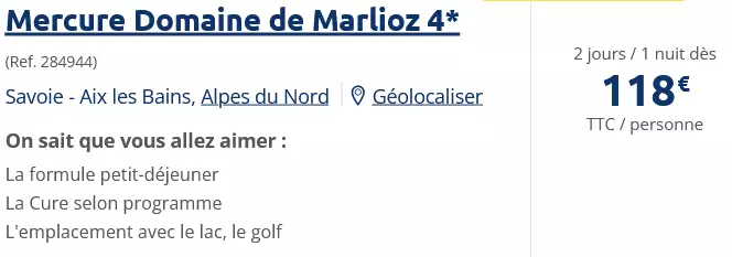 Venez vous détendre et déconnecter du quotidien en vous réservant un moment thalasso le temps d'un week-end ou plus si vous le souhaitez. Véritable cocon niché à Aix les Bains en Savoie, l'Hôtel Mercure Domaine de Marlioz 4* vous accueille au coeur du parc du domaine. A travers son cadre verdoyant, c'est une véritable invitation à la détente et au repos que nous vous proposons lors de votre séjour thalasso en Savoie.