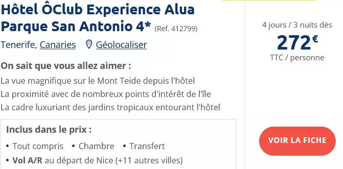 Nous conseillons Tenerife aux personnes qui souhaitent des vacances pas chères au soleil et en Europe. C'est une destination idéale que vous voyagiez seul(e), en couple, entre amis ou en famille. Le climat y est agréable presque toute l'année. Privilégiez cependant la période estivale si vous voulez profiter des plages et de la chaleur.