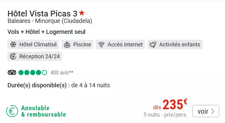 Vous serez hébergés à l'hôtel Vista Picas 3* en appartement familial entièrement équipé. Le complexe se situe non loin des plages de Cala'n Forcat, Picas Cala et Cala'n Blanes. Vous trouerez une piscine mais également un bar restaurant. Un arrêt de bus se trouve devant l'établissement ce qui est appréciable pour les ballades sur Minorque.