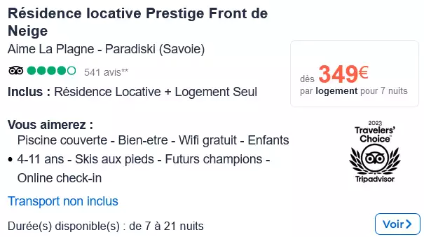La Résidence locative Prestige Front de Neige est implantée sur le domaine de La Plagne. C'est un immense batîment directement inspiré d'une ambiance "chalet montagnard". Elle possède une piscine couverte chauffée avec bains à remous, hammam et espace massage. Elle se compose de plusieurs appartements prêts à vous recevoir, avec tout l'équipement nécessaire pour un séjour parfait.
