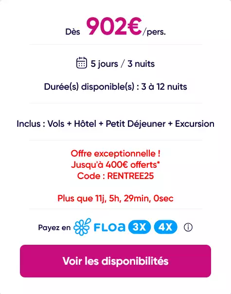 - 💸 Formule clé en main avec petit-déjeuner inclus et options d’assurance voyage dès 25 € pour partir l’esprit serein.