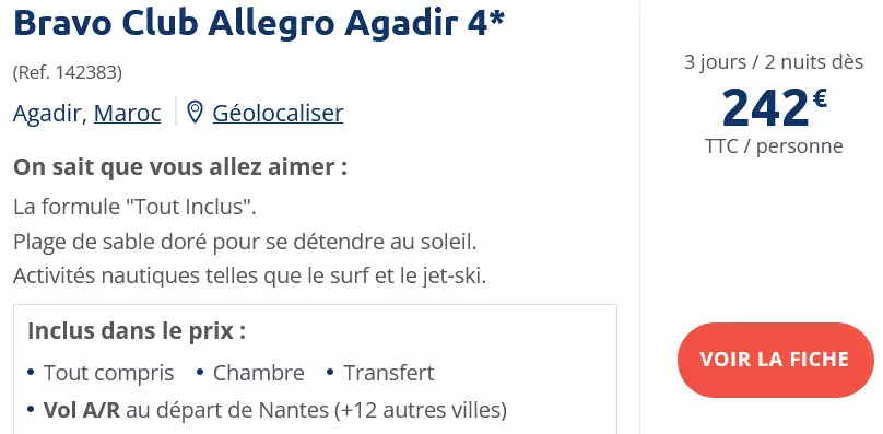 Vous cherchez une destination pas chère pour voyager peu importe la saison ? Réservez votre prochain voyage pas cher au Maroc ! Profitez d'un séjour tout inclus à Agadir à petits prix le temps d'un week-end, d'une semaine ou plus ! Offre à petit prix à ne pas rater !