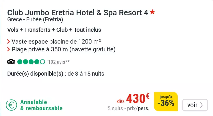Réservez vite votre prochain séjour en Grèce et profitez de vacances all inclusive sur l'île d'Eubée ! Réservez dès maintenant ! Plusieurs offres intéressantes sont encore disponibles !