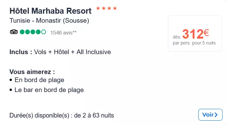 Votre séjour à l'Hôtel Marhaba Resort 4 * vous est proposé en formule all inclusive pour un séjour sans stress ! L'établissement se situe au coeur de la zone touristique de Sousse, à 10 minutes du centre ville seulement. Le Resort possède un grand nombre d'infrastructures pour que petits et grands profitent à fond de leur séjour. 5 piscines (dont 1 couverte et chauffée), terrains de tennis, mini-golf, pétanque, centre de squash, bar, discothèque et beaucoup d'autres à découvrir. Votre Resort possède un atout majeur puisqu'il est situé en bord de plage ! Ne manquez pas de venir déguster un petit cocktail vitaminé au bar de cette dernière. Tunisie rime avec vacances en famille ! Alors ne ratez pas l'occasion de profiter d'un séjour tout compris à Sousse et résevez vite votre séjour au soleil !