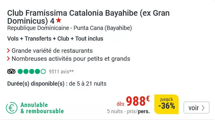 Un séjour all inclusive pas cher en République dominicaine ? Envolez vous pour Bayahibe et ses grandes plages de cocotiers. Soleil, détente, ballades et baignades serront au programme de votre séjour. La République dominicaine offre un cadre magnifique à ses visiteurs. Vous pourrez visiter, depuis votre lieu de séjour , l'île de Sanoa. De nombreuses randonnées pour découvrir la faune et la flore vous sont proposées.