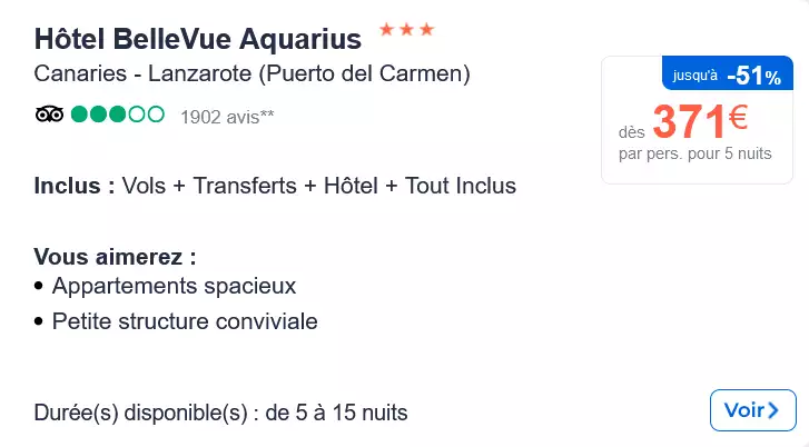 Vous serez accueillis à l'Hôtel BelleVue Aquarius 3* en formule tout-inclus. Cet établissement fort sympathique vous offrira un séjour reposant. Il bénéficie d'une situation idéale puisque qu'il se trouve sur les hauteurs de Puerto del Carmen non loin du port de pêche et de la marina. Vous serez logés en appartement standard idéalement équipé. Une piscine =, un restaurant et 2 bars viendront parfaire vos vacances. Un séjour tout-inclus aux Canaries pas cher et reposant vous attend ! Résevez vite si vous voulez profiter de ce petit prix !