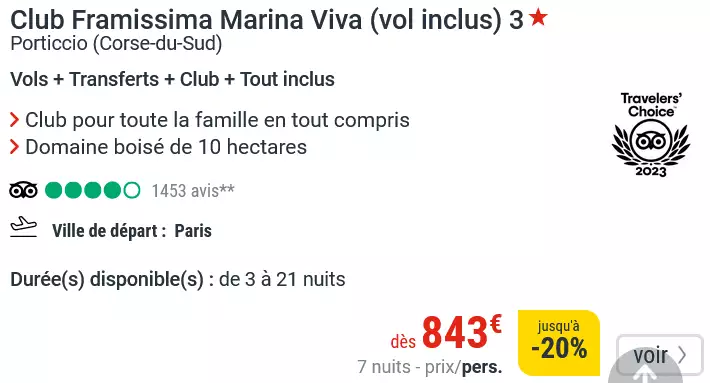Vous serez accueillis à l'Hôtel Club Framissima Marina Viva 3* situé sur la baie d'Ajaccio avec un accès direct à la plage. Situé au coeur de Porticcio, il est implanté au milieu de pins, de mimosas, d'eucalptus ou encore de palmiers pour une ambiance vaacances invitant au repos et à la farniente. Vous serez hébergés en chambre double standard d'une superficie de 17 à 21 m² (chambres plus spacieuses disponibles à la réservation). Vous profiterez de votre frmule "tout compris" au restaurant principal de l'hôtel offrant une cuisine variée avec plats corses 1 fois/semaine. Une équipe d'animations motivée et pleines d'idées sera présente pour vous préparer diverses activités adaptées aux petits et aux grands !
