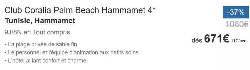 Profitez d'un séjour en Tunisie pas cher ! Partez cet été pour Hammamet en formule tout inclus en famille, en couple ou entre amis ! Réservez vite votre séjour ! Les places sont limitées!