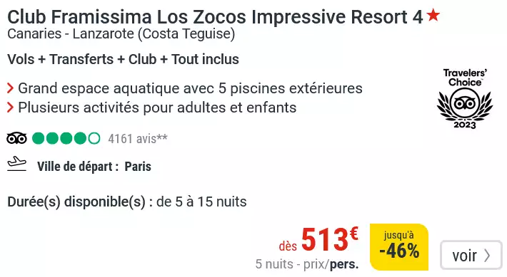 Vous serez accueillis à l'Hôtel Framissima Los Zocos Impressive Resort 4* situé sur la jolie station balnéaire de Costa Teguise. Le Resort se situe en bord de mer au coeur de grands jardins tropicaux. Les boutiques, plages et restaurants de la station sont seulement à 100 mètres de l'hôtel. Durant votre séjour, vous serez hébergés en suite junior de 36m² pouvant accueillir 3 adultes ou 2 adultes et 2 enfants. Vous profiterez de votre formule all inclusive au restaurant principal de l'hôtel qui vous servira une cuisne locale et/ou internationale sous forme de buffet. Une équipe d'animations motivée et dynamique est présente sur le site pour vous concocter activités ludiques et sportives pour petits et grands en journée et spectacles en soirée.