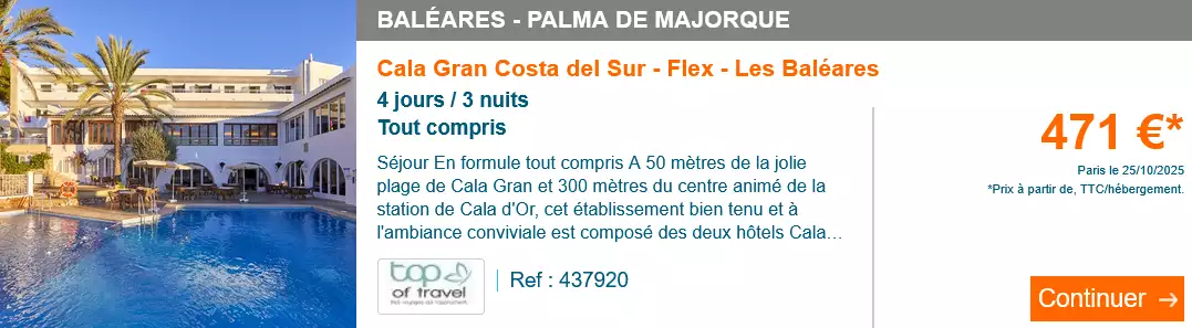 Votre séjour au Hôtel Cla Gran Costa del Sur Flex 3 * vous est proposé en formule all inclusive pour un séjour 100% calme et tranquilité ! Vous êtes situés à 50 mètres de la plage et à 300 mètres de la station balnéaire de Cala d'Or. De nombreuses activités y sont proposées telles que : aquagym, réveil musculaire, fitness, spectacles, soirées dansantes... L'hôtel dispose de 4 grandes piscines, d'un restaurant et d'un snack-bar pour profiter de votre formule tout inclus.