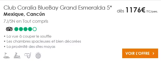 Vous serez accueillis au Club Coralia BlueBay Grand Esmeralda 5*. Entouré de jungle et de mangroves et bordé par la sublime et chaude mer des Caraïbes, vous serez en immersion totale et pourrez partir à l'assault des nombreux sites archéologiques et profiter "sans modération" des eaux claires et limpides de Playa del Carmen.