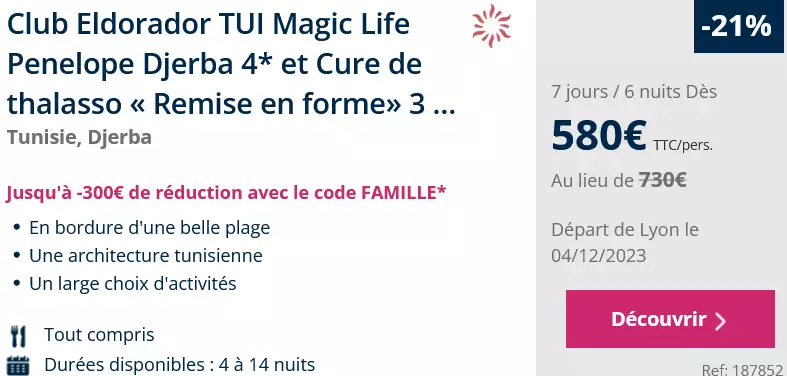 Vous serez accueillis à l'Hôtel Club Eldorador TUI Magic Life Penelope 4* au bord d'une jolie plage de sable fin dans un cadre verdoyant avec de grands palmiers. L'hôtel est totalement inspiré d'une architecture typique du pays. Vous serez accueillis en chambre standard climatisée avec un balcon ou terrasse. Vous profiterez de votre formule all inclusive au restaurant principal de l'hôtel où vos repas vous seront servis sous forme de buffet varié avec une cuisine locale et internationale pour ravir toutes les papilles ! Détente, farniente et repos ! Profitez de votre cure de cure de "remise en forme" incluse qui vous proposera un joli programme avec soins, massages, douches à affusion... de quoi parfaire votre séjour loin de votre routine quotidienne !