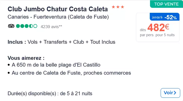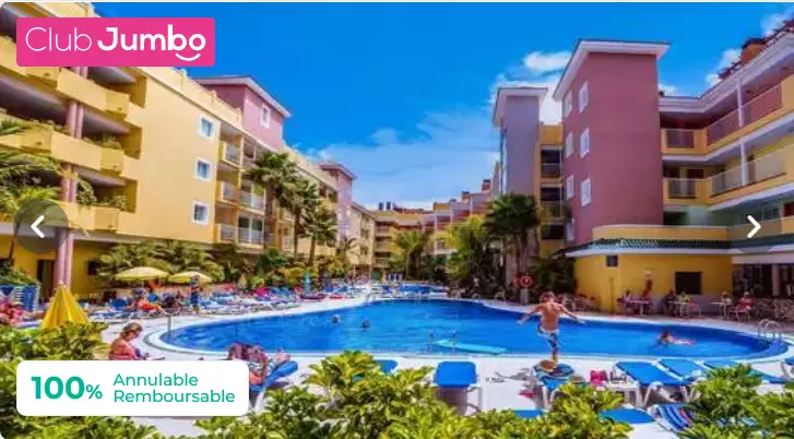 Vous serez accueillis à l'Hôtel Club Jumbo Chatur Costa Caleta 3*. Idéalement situé au coeur de Calete de Fuste, il offre un vasta choix d'activités et d'animations pour toute la famille. Le club compte, entre autres, 3 piscines (dont une chauffée l'hiver et une en toit terasse pour adultes uniquement), une salle de fitness, un terrain multisports et un club enfant. Vous serez hébergés en chambre standard basique entièrement équipé ( sèche-cheveux, climatisation, tv, salle de bain...). La plage est seulement à 650 mètres. Pour résumer : des vacances au Canaries en formule tout inclus adaptées à toute la famille, un Hôtel Club avec animations et mini-club, ne tardez plus et envolez vous faire une pause au soleil !