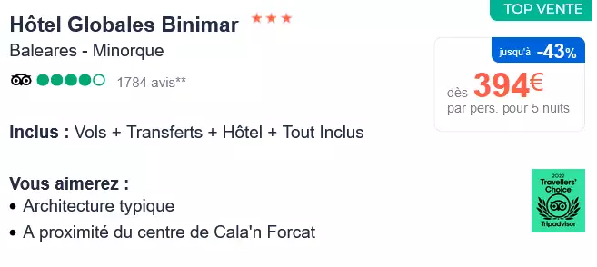 Réservez vite votre prochain séjour tout all inclusive aux Baléares et posez vos baganges à Minorque où soleil plage et ballades vous attendent ! Profitez des meilleures offres de séjours maintenant !