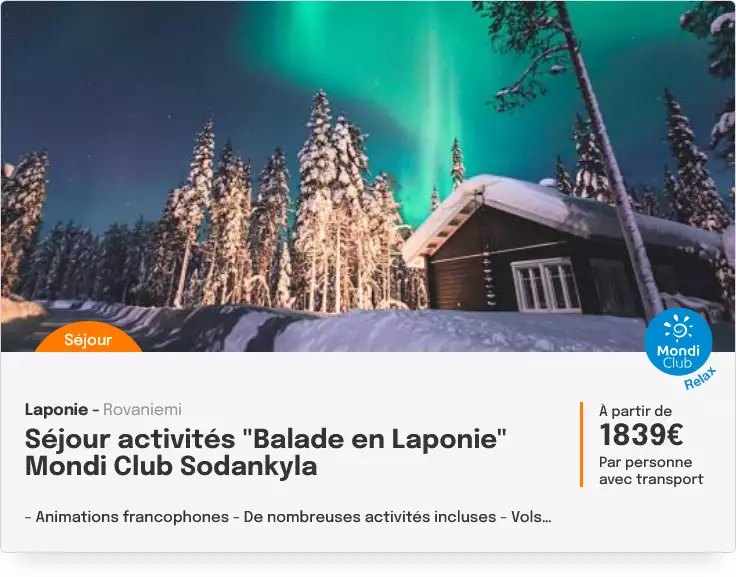 - Prix du séjour tout compris Mondi Club Sodankylä : à partir de 1889 € par personne pour une semaine, vols, hébergement, pension complète, activités phares incluses18