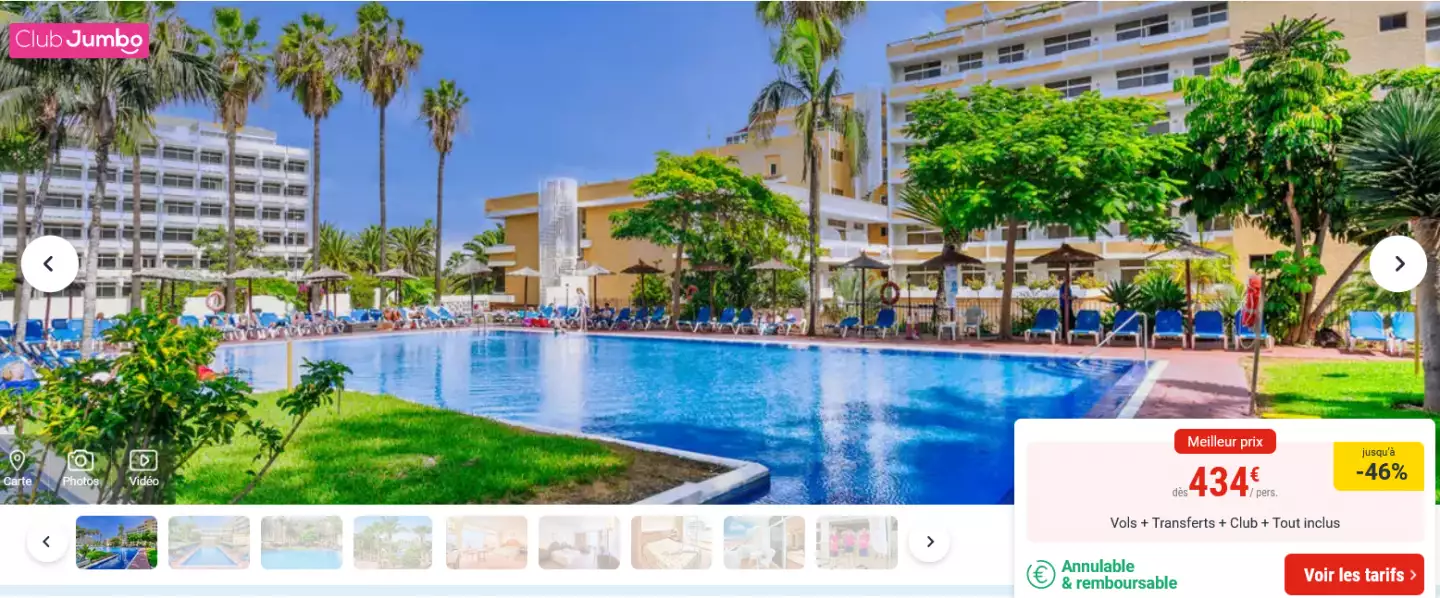 Vous serez hébergés à l'hôtel Club Jumbo Bluesea Puerto Resort 3* en chambre standard. Votre formule tout compris vous donne accès au restaurant de l'établissement sous forme de buffet à volonté. A votre disposition : une plage à 1.5 km, 2 piscines aménagées, une salle de fitness, un spa, ...