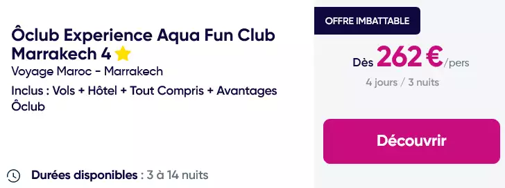 Vous serez accueillis à l'hôtel Ôclub Experience Aqua Fun Club Marrakech 4* où farinente piscines et toboggans seront au rendez-vous ! Offrez vous le luxe d'un hôtel avec un immense Aqua Park avec une vue splendide sur l'Atlas ! L'établissement se situe à l'exterieur de la ville mais des navettes gratuites sont mises à votre disposition pour vous rendre dans le coeur de Marrakech.